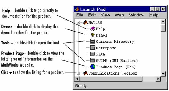 1.4.2.3. Fereastra Launch Pad. Fereasta Launch Pad din MATLAB permite accesul usor la unelte, demo-uri, si documentatia produselor MathWorks. Pentru lansare selectati Launch Pad din meniul View din MATLAB Desktop. Îndata sunt listate toate produsele MathWorks instalate pe sistemul dvs.