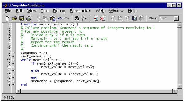 Lansarea ferestrei Editor/Debugger fara a lansa MATLAB. Pe platformele Windows, puteti folosi MATLAB Editor fara sa lansati MATLAB prin dublu-clic pe fisierul M-file în Windows Explorer. Fisierul M-file se deschide în MATLAB Editor. Pentru a deschide fereastra Editor fara fisier, lansati fisierul MATLAB6p5/bin/win32/meditor.exe. Se pot deschide mai multe sesiuni simultane de meditor. Când lansati MATLAB Editor fara lansare MATLAB, Editor devine o aplicatie de sine statatoare.