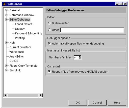 Proprietatile ferestrei Editor/Debugger se pot modifica selectând Preferences din meniul File al ferestrei MATLAB Desktop. Cutia de dialog se deschide si permite selectarea optiunii Editor/Debugger în urma careia se deschide fereastra Editor/Debugger Preferences de modificare a proprietatilor.