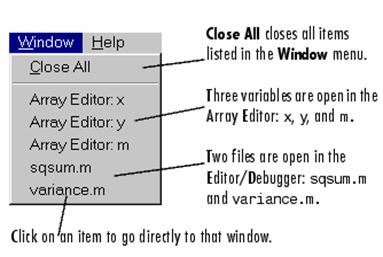 1.5.2. Cautarea documentelor folosind Desktop Tools. Meniul Window afiseaza toate documentele Editor/Debugger, toate variabilele din Array Editor, si toate ferestrele figura. Selectati o entitate în meniul Window pentru a ajunge direct la acea fereastra sau document. Selectati Close All pentru a închide toate entitatile listate în meniul Window. De pilda, meniul Window de mai jos ilustreaza trei documente deschide în Array Editor si doua documente deschise în Editor/Debugger. Selectând variance.m, de pilda, determina fereastra Editor/Debugger cu fisierul variance.m deschis, sa devina fereastra activa.