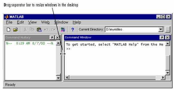 1.5.3. Redimensionarea ferestrelor. Pentru redimensionarea ferestrelor în MATLAB Desktop, se foloseste bara separator, care este bara dintre doua ferestre: Mutati cursorul deasupra barei separator. Cursorul capata o alta forma. Draggati bara separator pentru a modifica dimensiunile ferestrelor.