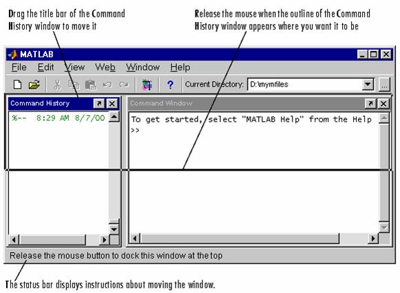 Mutare în interiorul MATLAB Desktop. Pentru a muta o fereastra într-o alta locatie în MATLAB Desktop draggati title bar-ul ferestrei spre noua locatie. Pe masura ce mutati fereastra, un contur al acesteia va deveni vizibil. Când conturul se apropie de o pozitie posibila, conturul se fixeaza în acea locatie. Status bar afiseaza instructiuni despre mutarea ferestrei în timpul schimbarii conturului. În exemplul de mai jos, Command History window este initial la stânga ferestrei Command Window si este mutata deasupra Command Window. Când title bar-ul ferestrei Command History atinge zona inferioara a toolbar-ului, conturul devine vizibil.