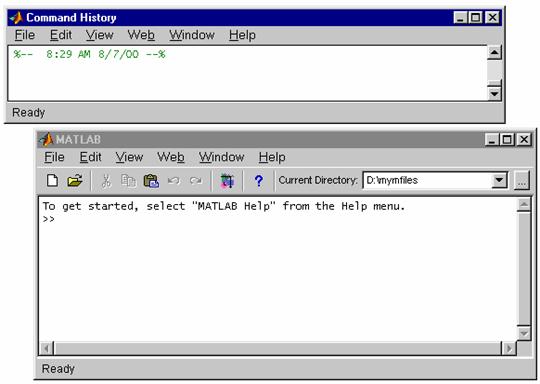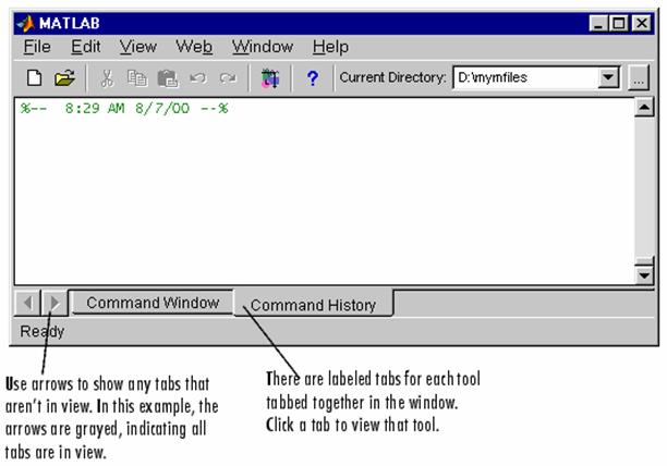 Apoi eliberati mouse-ul. Ambele ferestre ocupa acelasi spatiu si în zona inferioara a ferestrelor apar tab-uri ce permit identificarea ferestrelor. În exemplul urmator, fereastra Command History si Command Window sunt grupate împreuna, cu fereastra Command History activa.