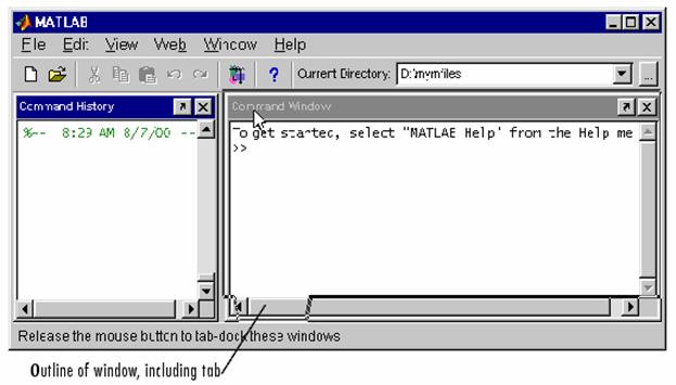 Gruparea (Tabbing) ferestrelor împreuna. Puteti grupa ferestrele asa încât acestea sa ocupe acelasi spatiu în MATLAB Desktop, pastrând însa accesul la toate ferestrele. Pentru a grupa împreuna ferestre mutati (dragging) title bar-ul unei ferestre din desktop deasupra title bar-ului unei alte ferestre din desktop. Conturul ferestrei pe care o mutati se suprapune peste fereastra a doua, si partea inferioara a conturului include un tab. În exemplul urmator, Command History window este initial la stânga Command Window si title bar este draggata deasupra title bar-ului ferestrei Command Window.