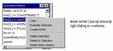 1.5.8. Meniul contextual. Multe dintre facilitatile MATLAB Desktop sunt disponibile din meniurile contextuale, cunoscute ca pop-up meniuri. Pentru a accesa un meniu contextual, clic-dreapta pe o entitate si meniul contextual împreuna cu operatiunile specifice devine vizibil. Mai jos se prezinta meniul contextual al ferestrei Command History window.