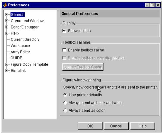 1.5.11. Proprietati generale ale MATLAB Desktop. Puteti modifica proprietatile predefinite ale MATLAB Desktop, cum ar fi fontul utilizat în Command Window. Proprietatile ramân valabile pe durata sesiunii MATLAB. Unele ferestre va permit controlul acestor aspecte din meniul propriu ferestrei respective. Pentru modificarea proprietatilor selectati Preferences din meniul File. Cutia de dialog Preferences se deschide si permite modificarea proprietatilor prin selectia tipului de proprietati.