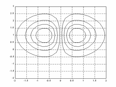 EXEMPLUL 1: Sa se reprezinte grafic conturul liniilor de nivel ale functiei z = x exp(-x2-y2) īn domeniul: -2 ≤ x ≤ 2 ; -2 ≤ y ≤ 3.