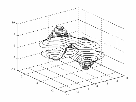 Reprezentarea grafica īn spatiu a liniilor de nivel constant se realizeaza cu functia contour 3; se apeleaza cu una dintre sintaxele: