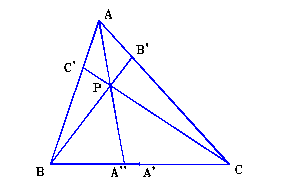 Teorema 1.3.3. (Reciproca teoremei lui Ceva). Fie ABC un triunghi si punctele A’I(BC), B’I(CA), C’I(AB).astfel incat, sau toate trei sa apartina laturilor respective,sau unul sa fie situat pe o latura, iar celelalte doua pe prelungirile cate uneia din celelalte doua laturi.