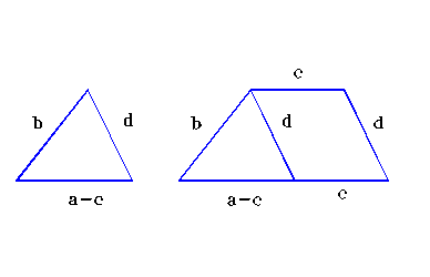 Demonstratie: ( fig. 4.3.2). fie a,b,c ,d lungimile laturilor unui trapez, astfel incat a si c sunt lungimile bazelor trapezului ( a>c), iar b si d sunt lungimile laturilor neparalele. Se construieste triunghiul avand ca lungimi ale laturilor a-c, b si d, apoi se translateaza latura de lungime b ( sau de lungime d) pe directia corespunzatoare dreptei pe care se afla segmentul a-c cu un vector de lungime c .