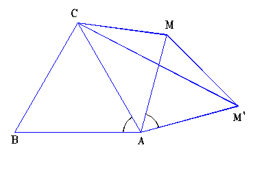 Demonstratie: ( 4.3.3) Consideram rotatia de centru A si unghi α= 600 care duce punctul B in C. Prin aceasta rotatie, punctul M merge in M’, astfel incat AM = AM’si m( < MAM’)=600T AM=AM’. Segmentul [MB} merge in segmentul [M’C], deci MB=M’C. Este usor de vazut ca laturile triunghiului M’MC sunt [MM’]s [MA], [M’C]s [MB] si [MC].
