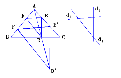 Demonstratie: ( fig. 4.3.4.) Se construieste mai intai un triunghi D’E’F’ avand laturile paralele cu cele trei drepte date si avand doua varfuri pe doua laturi ale triunghiului ABC.