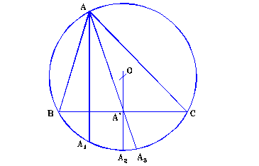 Analizand figura alaturata, rezulta urmatoarea constructie. Se construieste cercul C(O, r), circumscris triunghiului A1A2A3, apoi se uneste O cu A2. Paralela prin A1 la OA2 intersecteaza cercul C(O,r) in punctul A. Se uneste A cu A3 si fie =OA2 AA3. Perpendiculara in A’ pe OA2 intersecteaza cercul C(O,r) in punctele B si C. Prin unirea lui A cu B si C se obtine triunghiul cerut de problema.