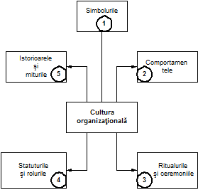 Prin simboluri culturale se transmit sensuri ce releva filozofia si valorile, idealurile, credintele sau asteptarile partajate de salariatii organizatiei. Spre exemplu, un simbol poate fi insasi denumirea .