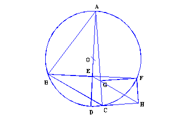 Problema 2.2.2. Fie un triunghi ABC inscris intr-un cerc de centru O. Perpendiculara BE pe diametrul AD taie, din nou, cercul in F. Paralelele prin F la CD si CA,taie CA si CD in G, respectiv H. Sa se arate ca punctele E,G,H sunt coliniare.