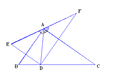 Cum E cu B si F cu C sunt puncte de aceeasi parte a lui AD, iar AD separa punctele B si C, rezulta ca AD separa punctele E si F, deci AI(EF). Asadar, unghiurile EAD si DAF sunt adiacente suplementare si deci, laturile lor necomune sunt in prelungire.Rezulta ca punctele E,A,F sunt coliniare. Reciproc, daca punctele E,A,F sunt coliniare, rezulta ca m(<EAD)+m(<FAD)=1800 si deci , 2m(<BAD)+2m(<CAD)=1800, adica m(<A)=m(<BAD)+m(<CAD)=900