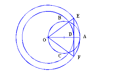 Problema 2.2.8. Se dau doua cercuri concentrice ( C1) si ( C2), de centru O. Pe raza OA, a cercului exterior (C1), ca diametru, se construieste cercul (C3) care intalneste cercul interior (C2) in punctele B si C. razele OB si OC intalnesc cercul (C1) in punctele E si F.Fie D intersectia lui OA cu cercul ( C2) . Sa se arate ca, punctele E,D,F sunt coliniare.
