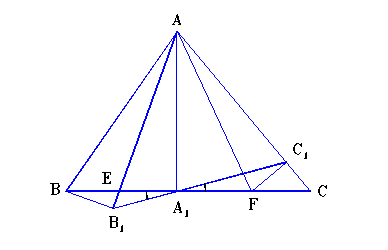 Problema 2.2.11. Fie ABC un triunghi oarecare si AE, AF doua drepte izogonale (drepte ce trec prin varful unui unghi si fac unghiuri congruente cu bisectoarea unghiului ).Proiectia lui B pe AE este B1, proiectia lui F pe AC este C1 si proiectia lui A pe BC este A1.Sa se demonstreze ca punctele A1, B1, C1 sunt coliniare.