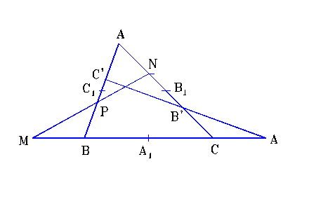 La fel se arata ca P I B’C’. Prin urmare, punctele B’, P, N, M, C’ sunt coliniare.