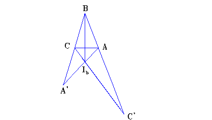 De aici, folosind reciproca teoremei lui Ceva, obtinem ca bisectoarele exterioare [AA’, [CC’, si cea interioara [BB’ sunt concurente intr-un punct pe care-l notam cu Ib si care este centrul cercului exinscris triunghiului ABC corespunzator lui B.