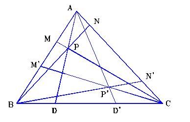 Problema 2.2.30. Daca intr-un triunghi oarecare ABC se duc cevienele AD, BN, CM concurente intr- un punct P atunci si cevienele lor izogonale AD’, BN’, CM’ sunt concurente intr-un punct P’. ( Punctele P si P’ se numesc puncte izogonale).