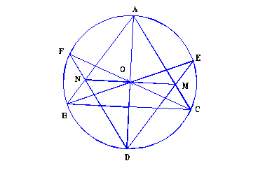 Demonstratie : ( fig. 2.2.32. ). Patrulaterele ABDE si ACDF fiind dreptunghiuri, rezulta ca BE si CF sunt diametre in cerc.Patrulaterul AMDN este paralelogram, de unde rezulta ca MN trece prin mijlocul lui AD, adica prin O. prin urmare, dreptele AD, CF, BE, MN sunt concurente.