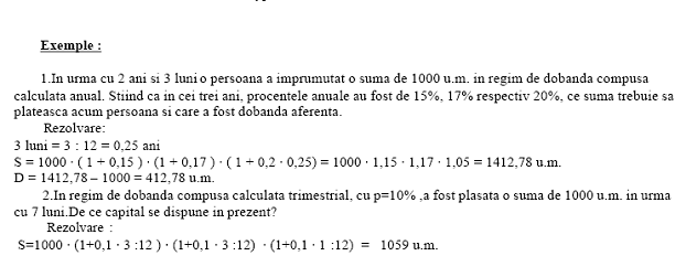 sfsrsitul primei perioade, dobanda simpla a acestei perioade este adugata la suma pentru a produce la randul ei dobanda in perioada urmatoare: Fie S 0 suma initiala ; p procentul; i =100 p dobanda unitara ; t durata de plasament a sumei S 0 (numar întreg) i S t suma finala dupa t perioade, atunci:
