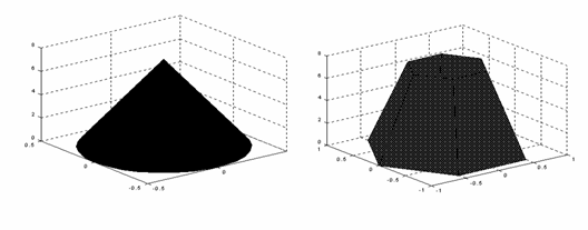 EXEMPLUL 9: Sa se reprezinte grafic un con de raza Rc1= 0,5 si înaltime Hc=7,5 si un trunchi de piramida cu baza hexagon, cu cercurile circumscrise bazelor de raze Rp1=1 si Rp2=0,5 si înaltimea Hp= 7,5.