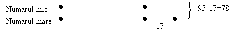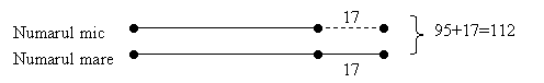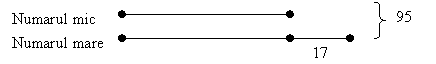 Pentru a rezolva aceasta problema vom reprezenta cele doua numere prin segmente de dreapta. Vom desena mai intai numarul mai mic, printr-un segment, apoi numarul mai mare. Stim ca acesta este cu 17 mai mare decat primul, deci il vom desena astfel: facem un segment egal cu cel care reprezinta primul numar, si ii vom adauga un segment suplimentar care va reprezenta cele 17 unitati ce reprezinta diferenta dintre numere.