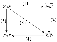 Observam ca ori de cate SaP este adevarata SiP este de asemenea adevarata, iar cand SiP este falsa, SaP este si ea falsa. Acelasi lucru este valabil pentru SeP si SoP. Cand, insa, SaP este falsa, SiP este si adevarata si falsa.