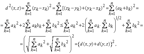 Pentru a verifica axioma triunghiului, vom folosi inegalitatea lui Cauchy-Buniakovski[1]: