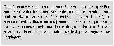 Vom numi test statistic, o metoda care ne ajuta sa decidem cu un grad de siguranta ales, daca ipoteza de nul poate fi respinsa în favoarea ipotezei sau ipotezelor alternative sau daca nu sunt suficiente dovezi care sa justifice respingerea ipotezei de nul.