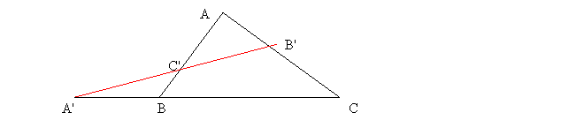 Reciproca : Daca A' apartine lui BC , B' apartine lui CA , C' apartine lui AB si daca A',B',C' sunt situate doua pe laturi si unul pe prelungirea laturii sau toate trei pe prelungirile laturilor si daca A'B/A'C*B'C/B'A*C'A/C'B=1 atunci punctele A',B',C' sunt coliniare .
