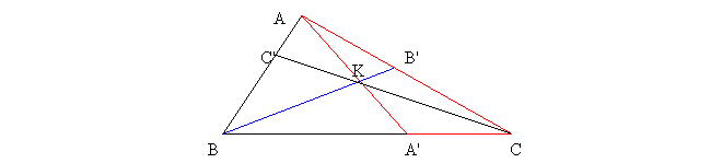 Reciproca : Se da Δ ABC , A' apartine lui BC , B' apartine lui CA , C' apartine lui AB ≠ varfuri , situate pe laturi sau un punct pe o latura si doua pe prelungirile laturilor . Daca A'B/A'C*B'C/B'A*C'A/C'B=1 => dreptele AA' , BB' , CC' sunt concurente .