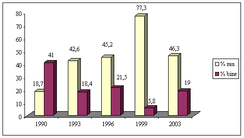 In lucrarea ,,Dinamica starii de spirit a populatiei in perioada de tranzitie. Elemente de calitate a vietii si politicile sociale" , autorii analizeaza date obtinute din Diagnoza Calitatii Vietii si din Barometrul de Opinie Publica, pentru perioada 1990-2003. Perspectiva utilizata cuprinde perceptii ale oamenilor legate de propriile conditii de viata, relatia cu mediul societal, aspecte legate de securitatea personala, de venituri si conditiile de locuire, de munca, dar si evaluari fata de modul in care este condusa tara, fata de posibilitatea de a participa la luarea deciziilor la nivel local, national, increderea in institutii, etc. In ceea ce priveste perceptia romanilor legata de calitatea conducerii tarii, se poate observa ca in anul 1999 imaginea asociata modalitatii de conducere este una negativa, valorile in acest sens fiind cu 32,1% mai mari decat in 1996. Numai 5,8% indivizi apreciaza in mod pozitiv viata politica, in 1999, fata de 41% in 1990. Anul 2003 aduce o schimbare fata de 1999, in sensul ca procentul celor care au o imagine pozitiva asupra conducerii tarii creste la 19%, iar procentul celor care considera ca tara este condusa rau scade, de la 77,3% la 46,3%.