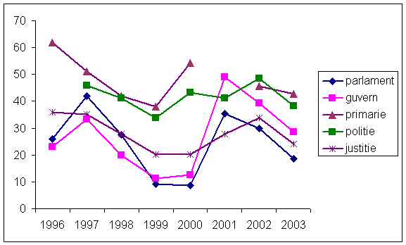 Urmarind analiza indicatorului increderea in institutii si selectandu-le pe acelea care constituie conducerea tarii, putem observa cum descriu curbele zona critica in care se afla. Increderea in Parlament si Guvern tinde sa creasca incepand cu anul 2000, ca apoi sa scada incepand cu anul 2001. O explicatie ar fi ca anul 2000 a fost unul electoral, speranta oamenilor pentru o viata mai buna din punct de vedere al prosperitatii, al bunastarii crescand in preajma alegerilor, ca mai apoi, dupa un an, sa realizeze ca asteptarile nu le pot fi indeplinite intr-un timp scurt. Institutia Primariei pare a fi cea in care oamenii prezinta cea mai mare incredere, acest fapt datorandu-se accesibilitatii mai mari la procesul de comunicare si colaborare dintre indivizi si organismul de conducere locala.
