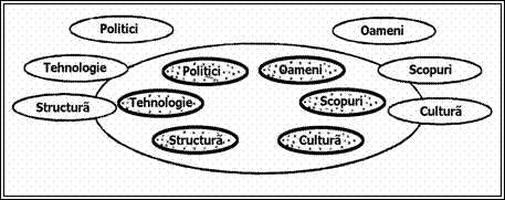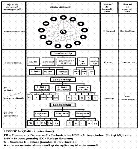 Sursa: prelucrare dupa modelul lui Henry Mintzberg, 1980 - Structure in 5's: A Synthesis of the Research on Organization Design; pentru reprezentari grafice si detalii, a se vedea lucrarea noastra: Ion Boboc, 2003 - Comportament organizational si managerial, vol. I, p. 110-112.
