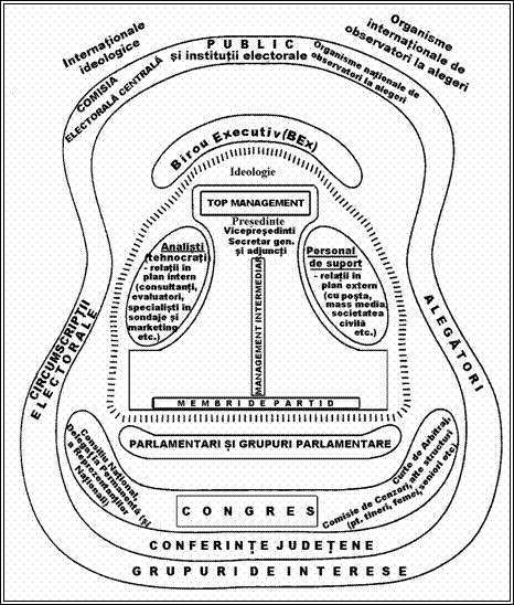 Reprezentam mai jos schema grafica a acestor ierarhii organizationale la nivelul unui partid, dupa modelul propus si analizat de profesorul Henry Mintzberg, cel mai des citat model de ierarhie organizationala functionala in tratatele de management si pe care noi l-am aplicat la organizatiile culturale (pentru detalii a se vedea lucrarile elaborate de noi: pentru organizatiile culturale - Ion Boboc, 1998 - Managementul cultural in economia de piata. Ghid practic, p. 9), la cele educationale (Boboc, 2002 - Psihosociologia organizatiilor scolare si managementul educational, p. 115), la cele industriale (Boboc, 2003 - Comportament organizational si managerial. Fundamente psihosociologice si politologice, vol. 2, p. 21) si la cele non-guvernamentale (Boboc, 2004b - Managementul organizatiilor non-guvernamentale, p. 23 si 34-35).