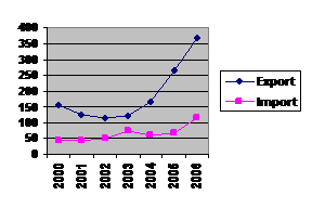 Grafic nr. 9. Evolutia schimburilor comerciale dintre Romania si Republica Moldova intre 2000‑ nov. 2006 (in mil. euro)