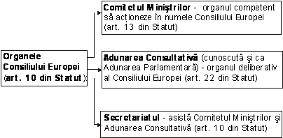Consiliul Europei are urmatoarele organe proprii: a) Comitetul de Ministri; b)Adunarea Consultativa; c) Secretariatul. Romania s-a alaturat Consiliului Europei, aderand la Statutul acestuia prin Legea nr. 64/1993.