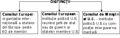 Consiliul European este una dintre institutiile politice ale Uniunii Europene. Reuneste sefii de stat sau de Guvern ai statelor membre U.E. Consiliul de Ministri al U.E. este tot o institutie politica a U.E., are compozitie interguvernamentala si este principalul organ cu atributii decizionale al U.E. de regula, in documente oficiale din doctrina, pentru a desemna Consiliul de ministri, se foloseste denumirea scurta "Consiliul". Nu este o regula stabilita oficial si expres. Referirea la institutie poate fi si trebuie sa fie si prin raportare la context.