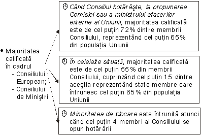 - Consiliul European se pronunta prin consens, cu exceptia cazului in care in Constitutie se prevede altfel - majoritate calificata (art- I-25). |