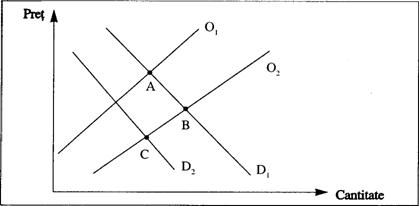 Daca initial, piata este in punctul de echilibru A, progresul tehnic (trecerea functiei de oferta de la 01 la 02) va antrena o puternica scadere a pretului (noul echilibru B). Instabilitatea cererii (deplasarea D1 la D2 si a echilibrului din punctul B si in punctul C) are acelasi efect asupra preturilor.
