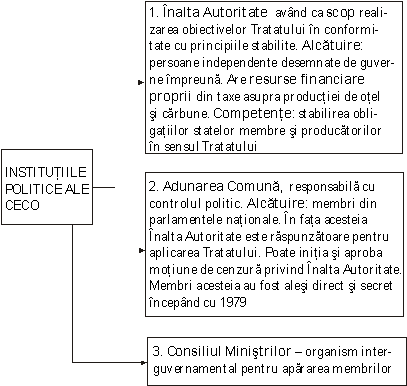 Tratatul CECO a creat patru institutii: o Inalta Autoritate, o Adunare responsabila cu controlul politic, un Consiliu al Ministrilor, constituiti din reprezentanti ai statelor membre, si o Curte de Justitie. Acestea aveau competente in domeniul pentru care s-a convenit Tratatul.