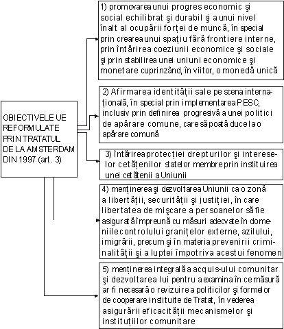 - Tratatul de la Amsterdam, intrat in vigoare la 1 mai 1999, cuprinde prevederi in domeniile protectiei drepturilor fundamentale ale cetatenilor, cooperarea in domeniul securitatii si al justitiei si dezvoltarea durabila a mediului inconjurator |