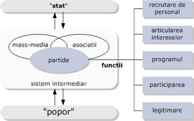 Aceste functii centrale, indispensabile oricarei democratii, sunt indeplinite de partide in asociere cu alti actori din sistemul intermediar: asociatiile si mass-media.