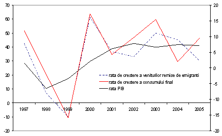 Figura 1. Cresterea anuala a veniturilor remise de emigranti, consumului final si a PIB