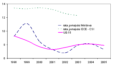 Figura 2. Ratele somajului īn Republica Moldova, ECE-CSI si UE-15, %