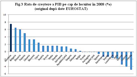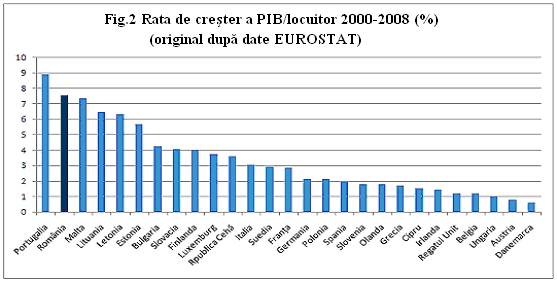 In graficul alaturat se poate observa pozitia Romaniei care se situeaza pe locul 2 in ceea ce priveste cresterea economica, cu un procent de 7,5% crestere a PIB pe perioada anilor 2000-2008 dupa Portugalia care a atins un procent de crestere economica de 8,9 pe aceeasi perioada. Cea mai scazuta crestere economica o inregistreaza conform datelor EUROSTAT, Austria cu 0,8% si Danemarca 0,6%. Desi aparent scazuta, cresterea economica, aceasta vine pe o economie nationala solida evidentiind de fapt stabilitate economica.