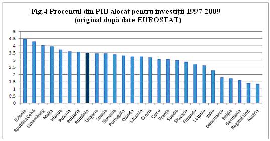 In perioada anilor 1997-2008 Romania a ocupat locul 8 in ceea ce priveste procentul din PIB alocat pentru investitii pe sectoare si anume 3,5 in timp ce Estonia prezenta un procent de 4,49 iar Austria 1,3, dupa cum se poate observa si in figura 4.